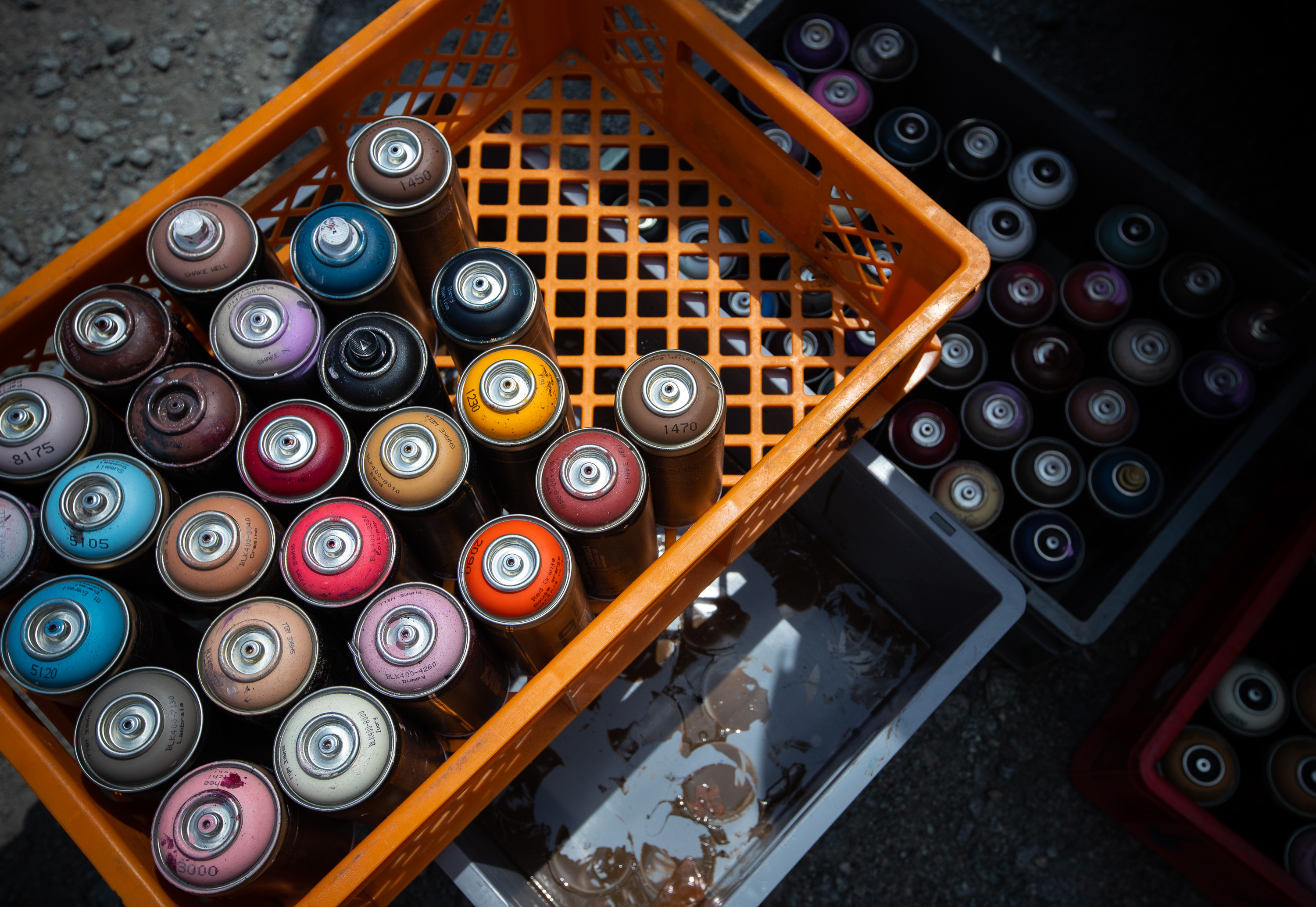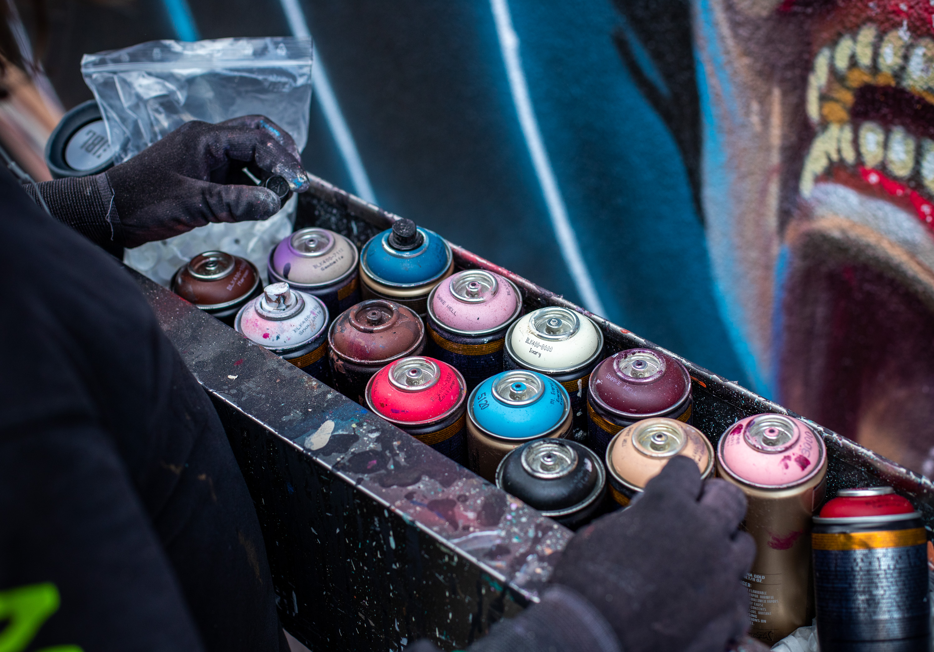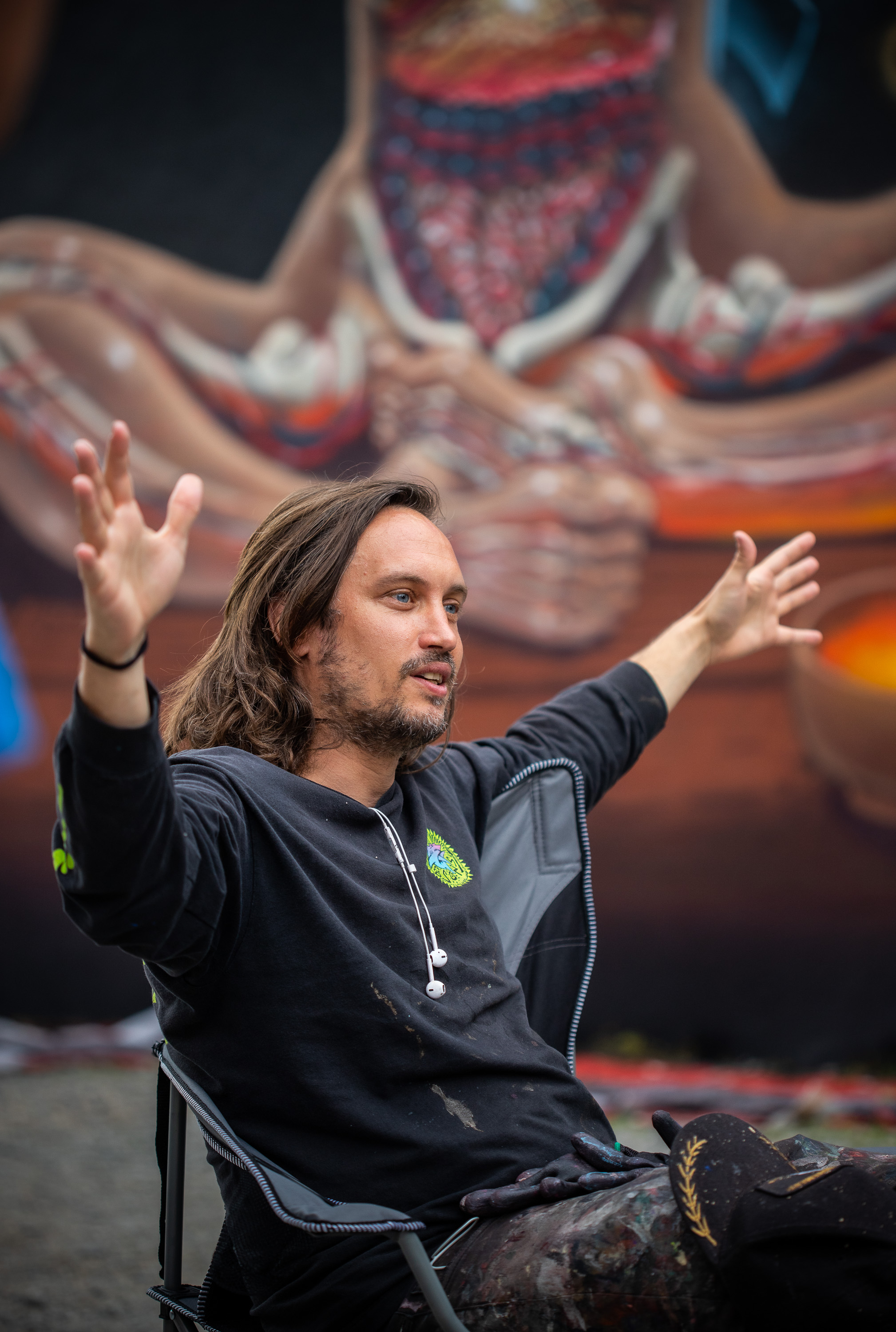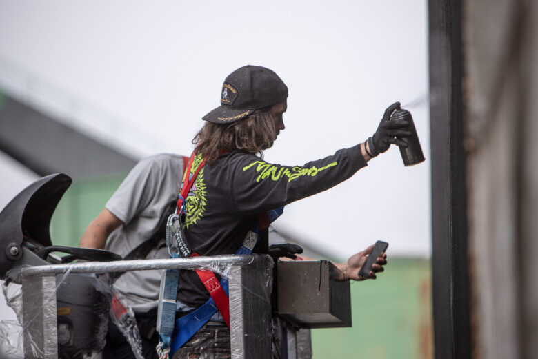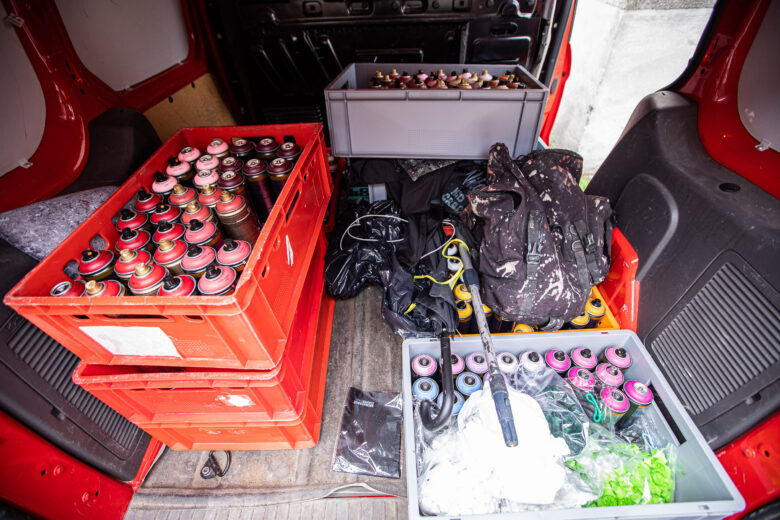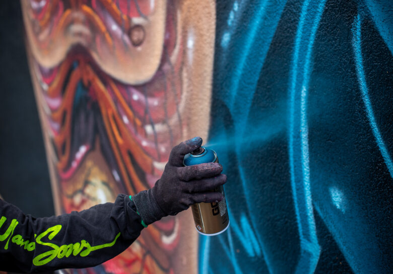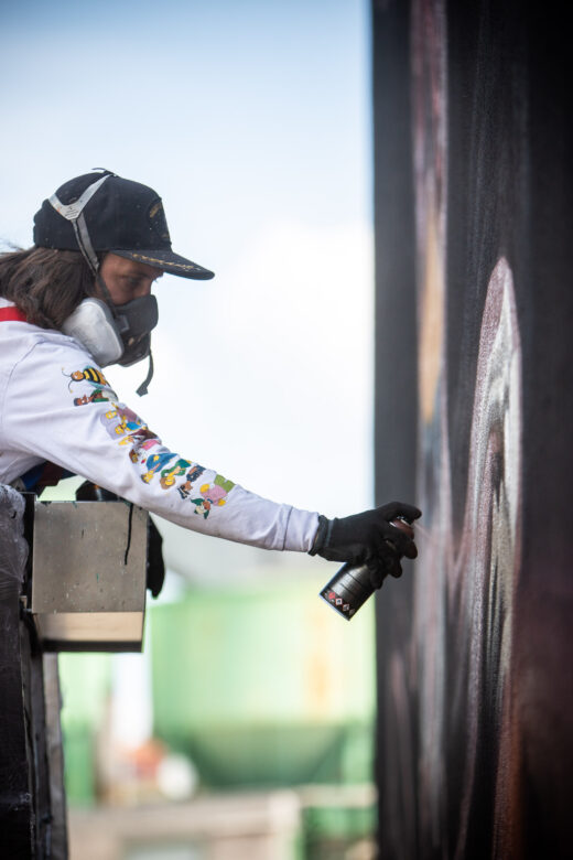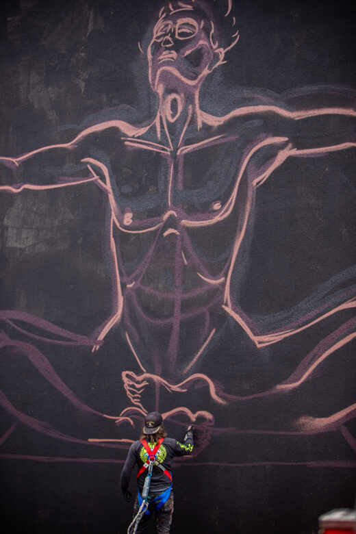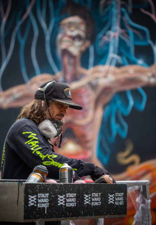 Mit Rockmusik im Ohr, einer Mischung aus Schokinag-Geruch und MontanaCans Lack in der Nase, und Schweiß auf der Haut, war der 38-Jährige gemeinsam mit seinem langjährigen Freund David Leitner drei Tage fieberhaft am Werk. Vom ersten Tag an verwandelte sich die eher ruhige Neckarvorlandstraße im Industriegebiet zu einer Pilgerstätte für Street-Art-Begeisterte, angezogen von der Mühelosigkeit, mit der NYCHOS sein eigenes Universum auf einer 15 Meter hohen Wand erschuff. Die Schnelligkeit, der Rausch, haben NYCHOS schon als Jugendlicher zum Graffiti und zur Sprühdose gebracht – und seit heute nicht mehr losgelassen. Leinwand oder Fassade – seine Antwort ist klar. Vor allem die großen Wände können mit seinem Tempo, seinen Ideen mithalten. „Nur mit der Sprühdose kann ich so schnell arbeiten, wie mein Kopf denkt.“