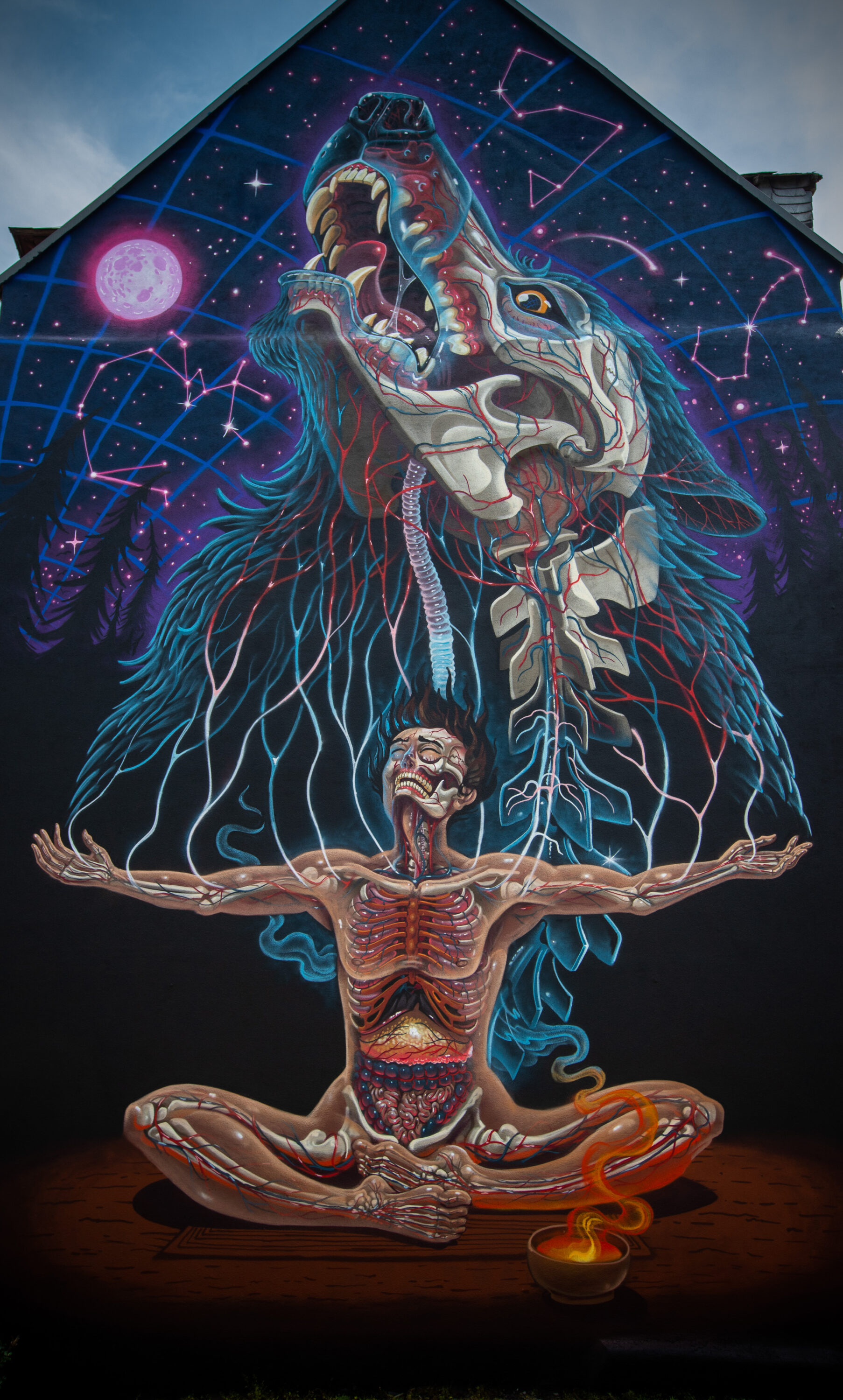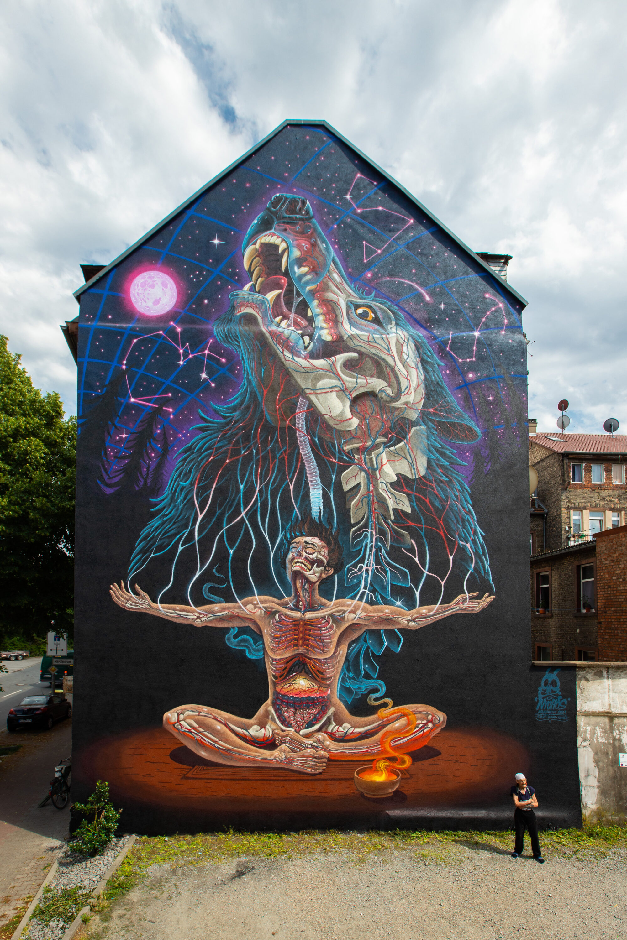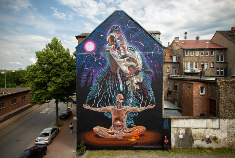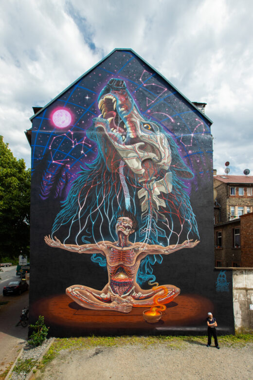 Erhaben richtet er sich auf und schickt seinen Ruf in den sternenüberzogenen Himmel. Der Wolf in NYCHOS neuestem Mural „Primal Truth“ verbindet den Menschen mit der spirituellen Welt – mit Sternenformationen, Matrix und Energie. „Das ist ein sehr persönliches Bild geworden“, sagt der weltweit gefeierte Street Artist aus Österreich, der das 32. Mural für STADT.WAND.KUNST geschaffen hat. In den letzten Jahren sei er durch Krankheit, Tiefen und Transformationen gegangen, die ihn und seine Kunst verändert haben. Statt seine Figuren zu zerteilen, wie er es in vielen Jahren seines Schaffens gemacht hat, blieben sie nun ganz, seien geheilt. Unverkennbar bleibt in NYCHOS neuem Werk aber die Transluzenz, die Lichtdurchlässigkeit seiner Figuren, die ihre Anatomie, ihr Inneres sichtbar machen.