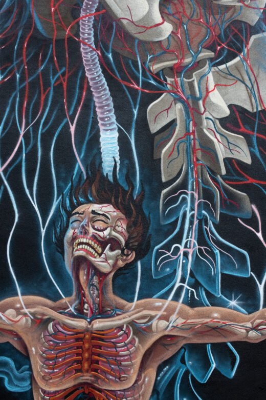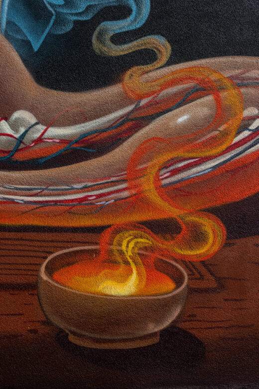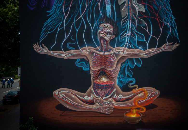 Seine Kindheit in einer Jägerfamilie und das Aufwachsen in der 80er- und 90er-Popkultur, seine Ursprünge im Gaffiti und Comic, sein Suchen nach Verbindung und Ganzheit – all das kulminiert in NYCHOS Kunst. Sie ist getrieben von ständiger Bewegung. Innere Prozesse manifestieren sich auf den Wänden dieser Welt. Nachdem NYCHOS jahrelang in seinen Werken Tiere und Pop-Figuren, von Raptoren und Schlangen bis hin zu Barbie, Mona Lisa und Micky Mouse, auseinandergenommen hat, spiegelt sein neues Mural nun vielmehr einen inneren Befreiungs- und Heilungsprozess wider. Angst finde ihren Ursprung immer in der Angst vor dem Tod. Sie gelte es aufzulösen, zu dekonstruieren, erzählt der Künstler, der gebürtig aus der Steiermark kommt. „PRIMAL TRUTH“ steht für das Leben, für Befreiung, Leere und Fülle zugleich. Und am Ende vor allem für eins: Heilung.